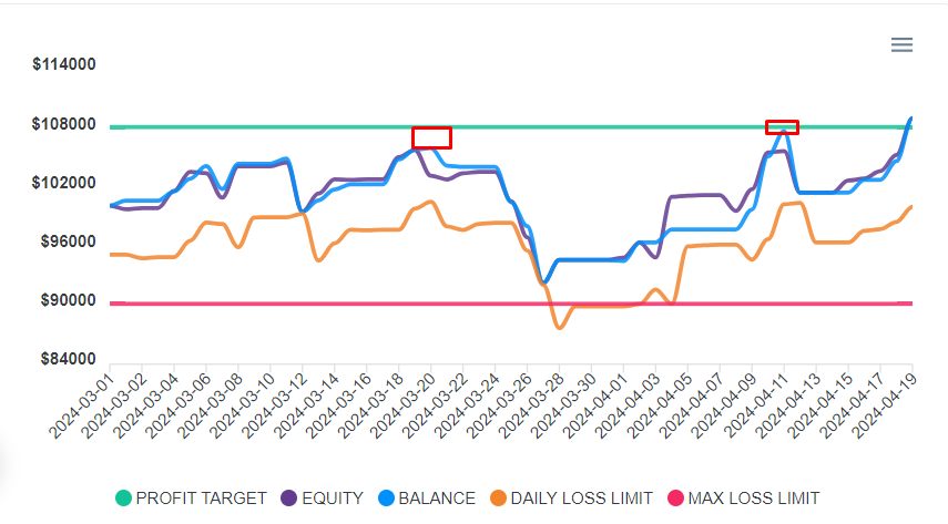 Te krzywe idealnie obrazują, jak niszczycielskie w skutkach może być dogrywanie. W drugim przykładzie brakowało niecałe 400$, przez dogrywanie rachunek wrócił właściwie do początkowej fazy. W pierwszym przykładzie dogrywanie zawiodło mnie zdecydowanie poniżej kreski. Rachunek był przez cały czas podpięty na naszym kanale discord i w momencie kiedy jego saldo wynosiło około 92000$, a do maksymalnej straty brakowało bardzo niewiele, większość spisała tę próbę na straty. Rachunek finalnie został zaliczony, jednak niewielu taka sztuka się powiedzie, jeśli wcześniej dopuszczą do takiego drawdownu.